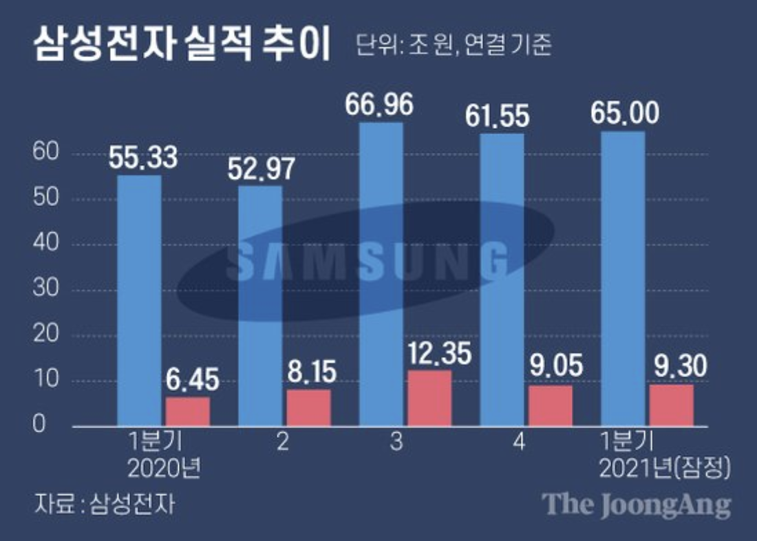 삼성전자가 21년도 1분기 9조원이 넘는 영업이익을 기록하며 시장 전망치를 넘어섰다고 합니다. 증권가에서는 주력인 반도체가 세계적인 공급 부족 사태에 따른 가격 인상 효과로 2분기부터 실적 개선에 더욱 기여하며 주가 상승 모멘텀으로 작용할 것으로 전망하고 있는데요.