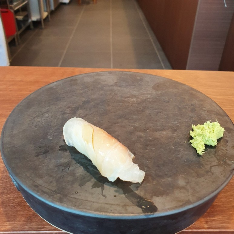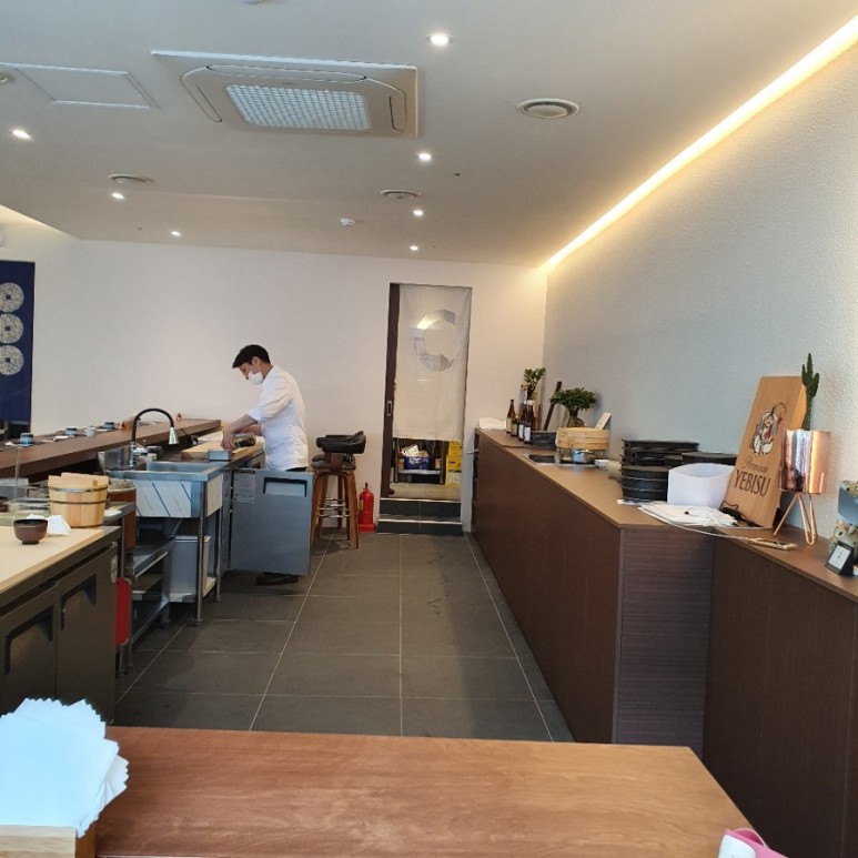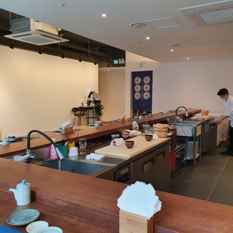 내부 모습입니다. 화이트 벽지가 매우 깔끔하면서 주방도 훤히 보이는 오픈된 공간에서 초밥을 쥐는 것을 볼 수 있어서 좋더라구요. 탁 트인 공간과 넓은 자리에서 즐기는 오마카세 정식이기 때문에 대접을 받고 있다는 느낌을 줬습니다.