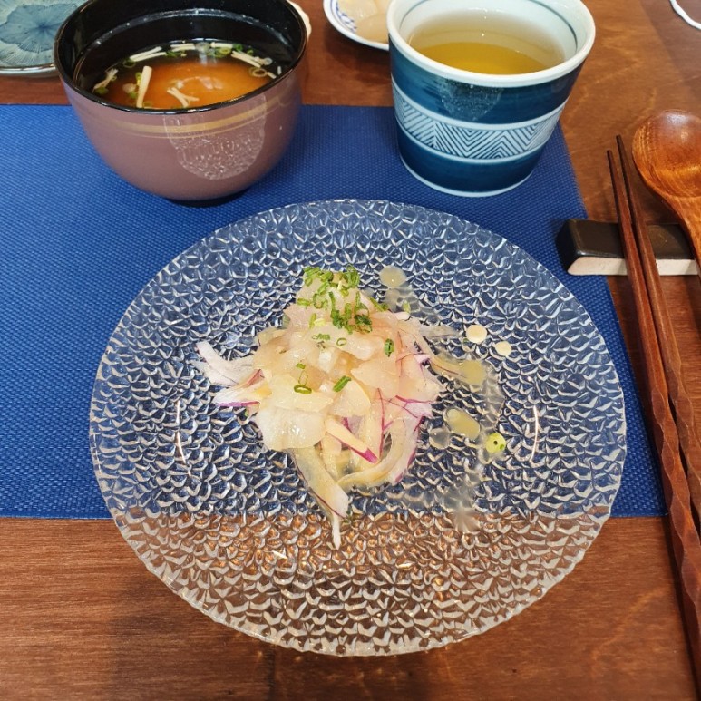 자리에 앉으면 시원한 녹차 물과 단무지, 락교, 초생강, 장국을 세팅해주세요. 그리고 처음 나오는 음식은 가쯔오부시로 맛을 낸 계란찜이에요.