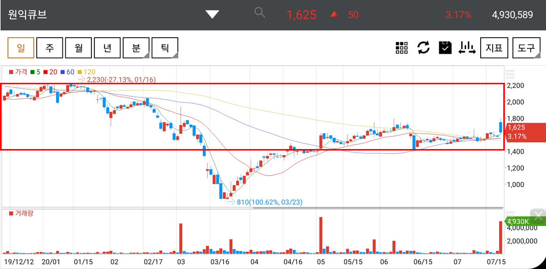 원익큐브 일보입니다. 현재 박스권을 이탈하지 않고 위아래로 횡보하고 있는 것을 확인하실 수 있습니다. 이미 20.3월, 5월에 매집이 이루어 져 있는 것을 확인하실 수 있습니다.