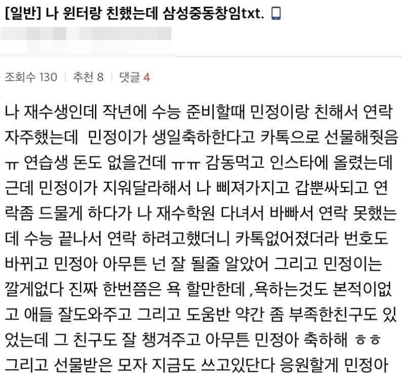 또 다른 네티즌 B씨는 "내가 재수생이었을 때 수능 준비 잘 하라고 윈터가 선물해 줬다. 잘 될 줄 알았다. 욕하는 것도 본 적이 없고 애들 잘 도와줬다."라고 밝혔습니다.
