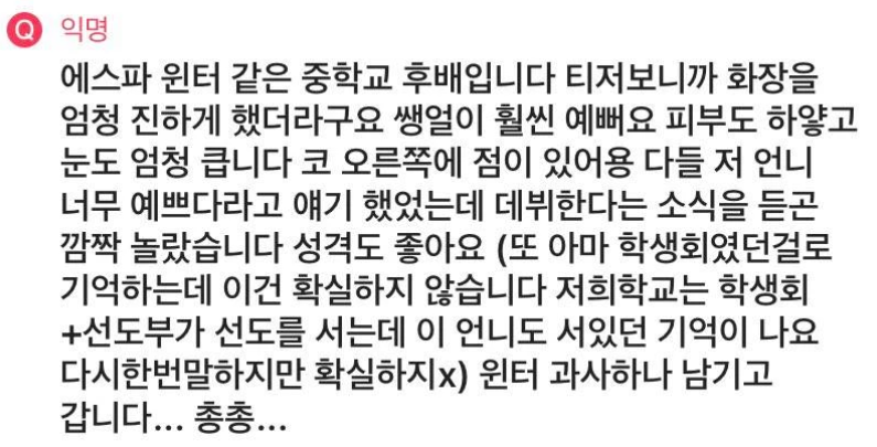지난 9일 페이스북 페이지 '아이돌이슈'는 윈터의 과거 사진과 온라인 커뮤니티에서 윈터와 함께 학창 시절을 보냈던 동창들의 글을 정리해 올렸다. 윈터의 중학교 후배라고 주장한 A씨는 "쌩얼이 훨씬 이쁘다. 성격도 좋고 꽃사슴상이다"라고 말했다.