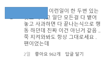 아래에는 BJ외질혜가 자신의 인스타그램에 등록한 해당 이슈에 대한 사과 댓글입니다.