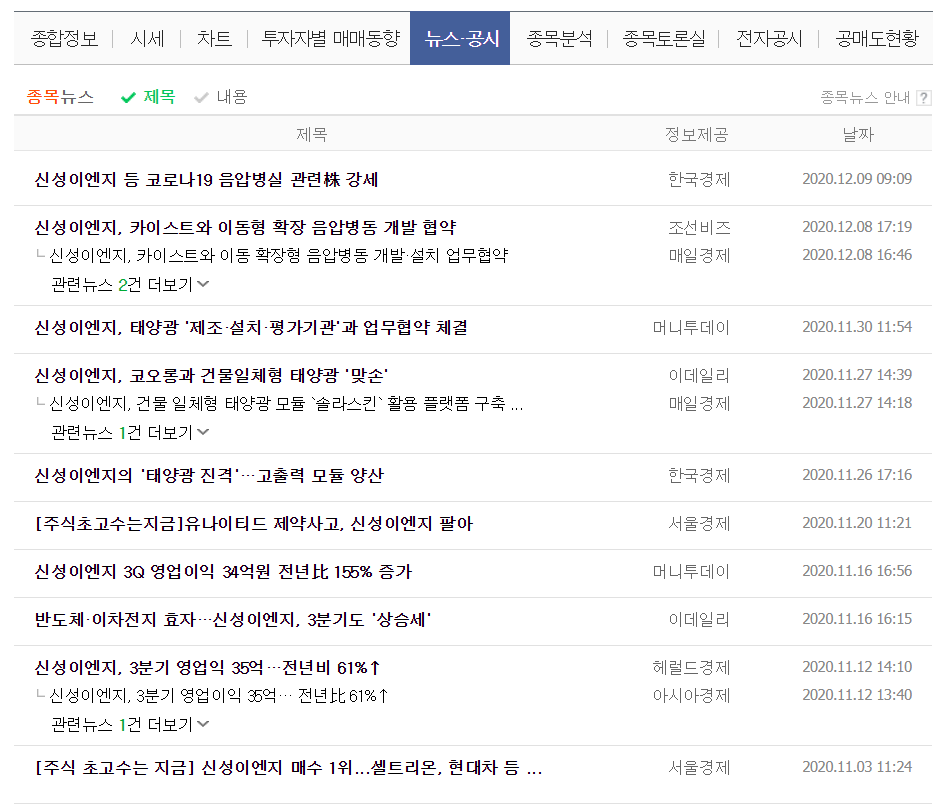 2020년 12월 08일 시간외단일가로 급상승한 신성이엔지에 대해 분석해보겠습니다.