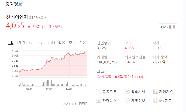 2020년 11월 9일에 태양광 발전 테마의 강세를 보이면서 신성이엔지는 상한가를 기록한 적도 있습니다. 개인적으로 태양열 관련주 중 가장 좋은 흐름을 보여준 종목이 신성이엔지이고 판단하였습니다.