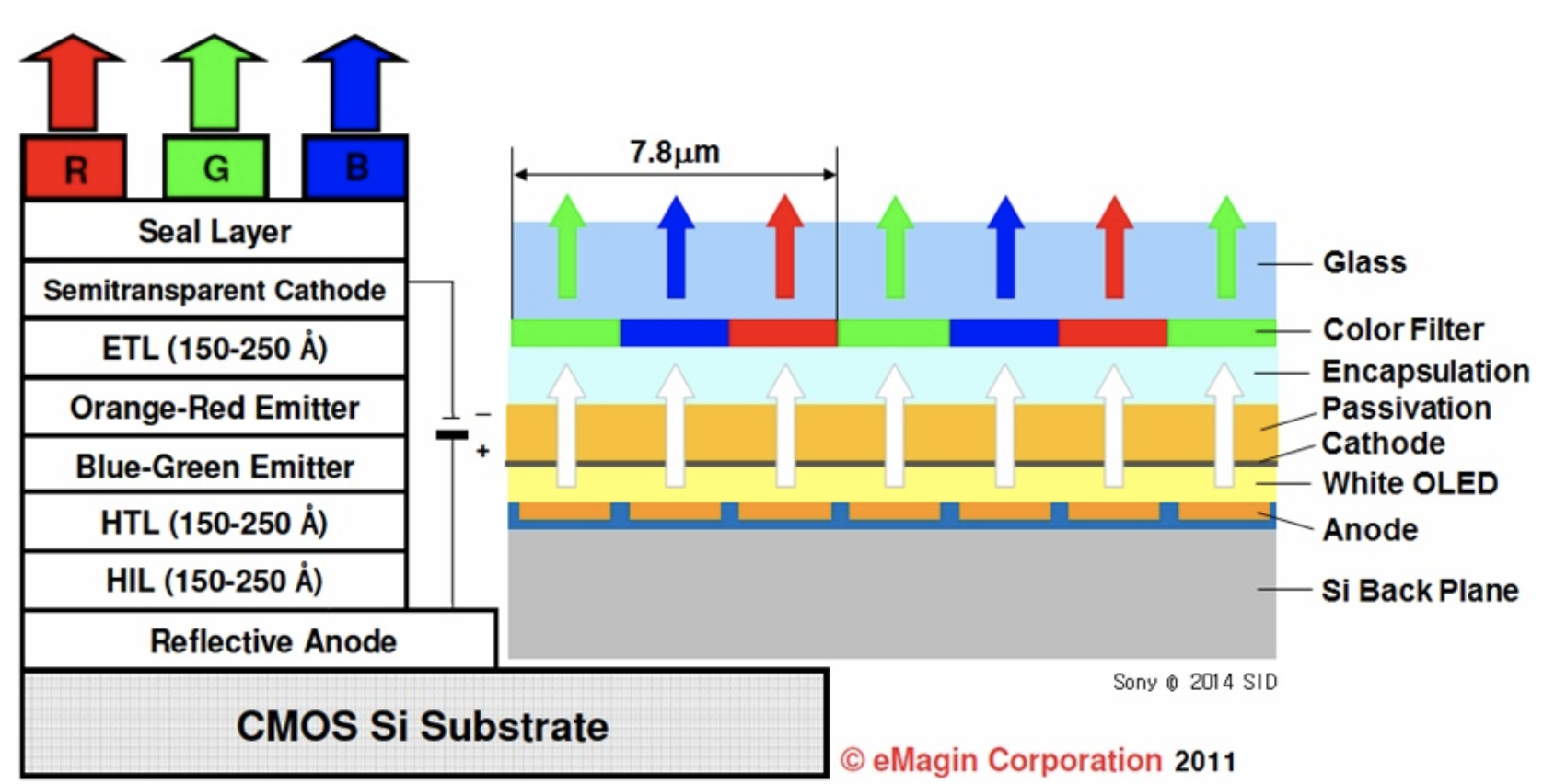 얇은 부피와 가벼운 무게에도 높은 해상도를 출력할 수 있으며, OLEDoS 는 OLED(유기발광다이오드)와 동작 원리 및 구조가 유사하지만 OLED보다 구동전압이 낮아야 하고 색깔 형성을 위해서는 특별한 기술이 필요하는 등의 연구 과제가 많습니다.