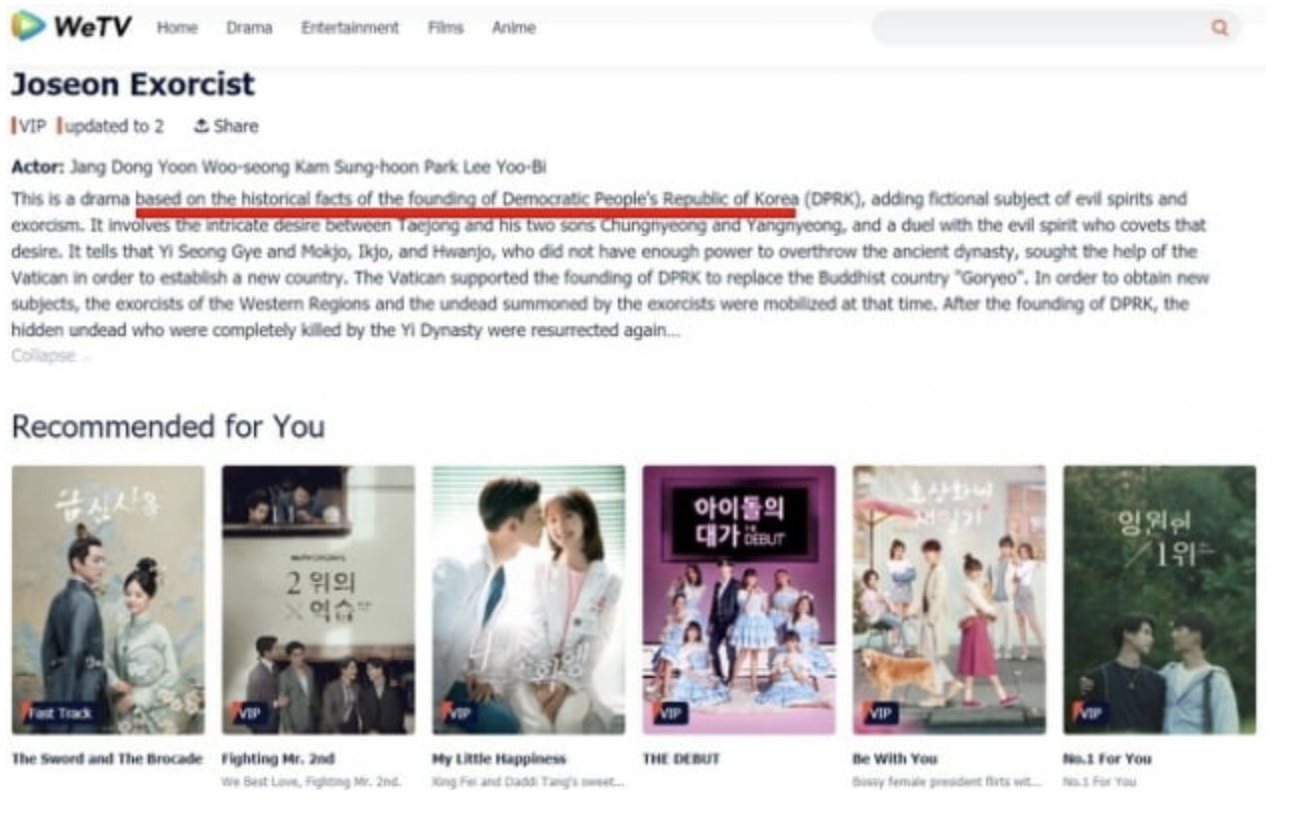 하지만 이후 중국 스트리밍 사이트 "WeTV"에 올라온 "조선구마사"에 대한 영문 소개에 "북한이 건국된 역사적 사실에 바탕을 둔 드라마"라고 설명하는가 하면, "바티칸이 불교 국가인 고려를 대체하기 위해 북한의 건국을 지지했다"고 소개되어 있습니다.